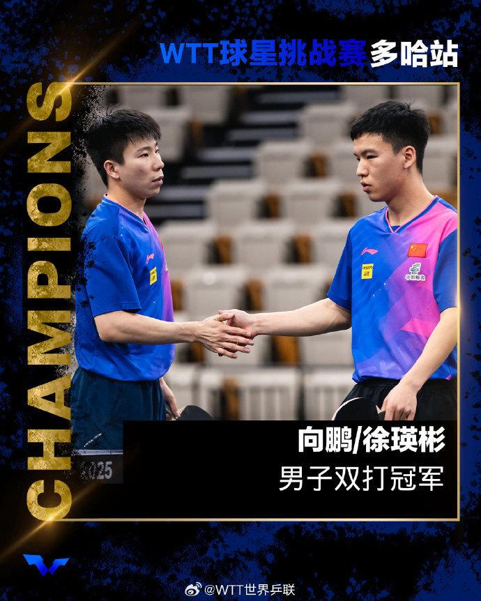 本次比赛,徐瑛彬搭档向鹏出战男双,他们一路过关斩将打进决赛,并在决赛中以3-2战胜张本智和/松岛辉空。